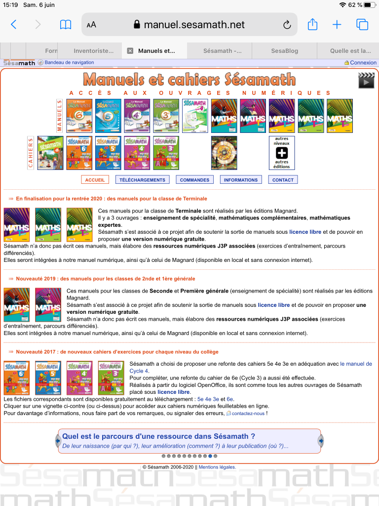 Sésamath n’est que l’auteur des manuels et cahiers Sésamath (et n’est qu’associée aux manuels pour le lycée). Sésamath ne vend rien. Sésamath met à disposition de tous, sans inscription, gratuitement, tous les manuels en version numérique sur son site internet. Et Sésamath met à disposition de tous, sans inscription, toutes les sources de ses ouvrages au format Open Office ou LaTeX, sous licence libre, donnant le droit à chacun de les télécharger et les modifier.
